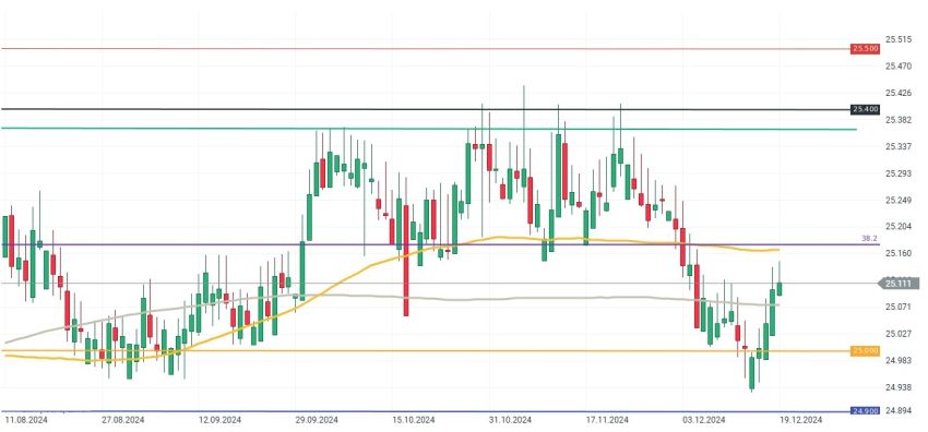 V případě oslabující koruny by domácí měna musela nejdříve opětovně ztratit nad Fibonacciho úroveň zpětného pohybu 38,2 na 25,18 EURCZK (fialová přímka). Další hranicí „v pořadí“ je střednědobá rezistence na 25,37 EURCZK (zelená úsečka). Další úrovní je poté další střednědobá rezistence 25,40 EURCZK (černá přímka). Následnou technickou hranici reprezentuje dlouhodobá rezistence na 25,50 EURCZK (červená přímka).